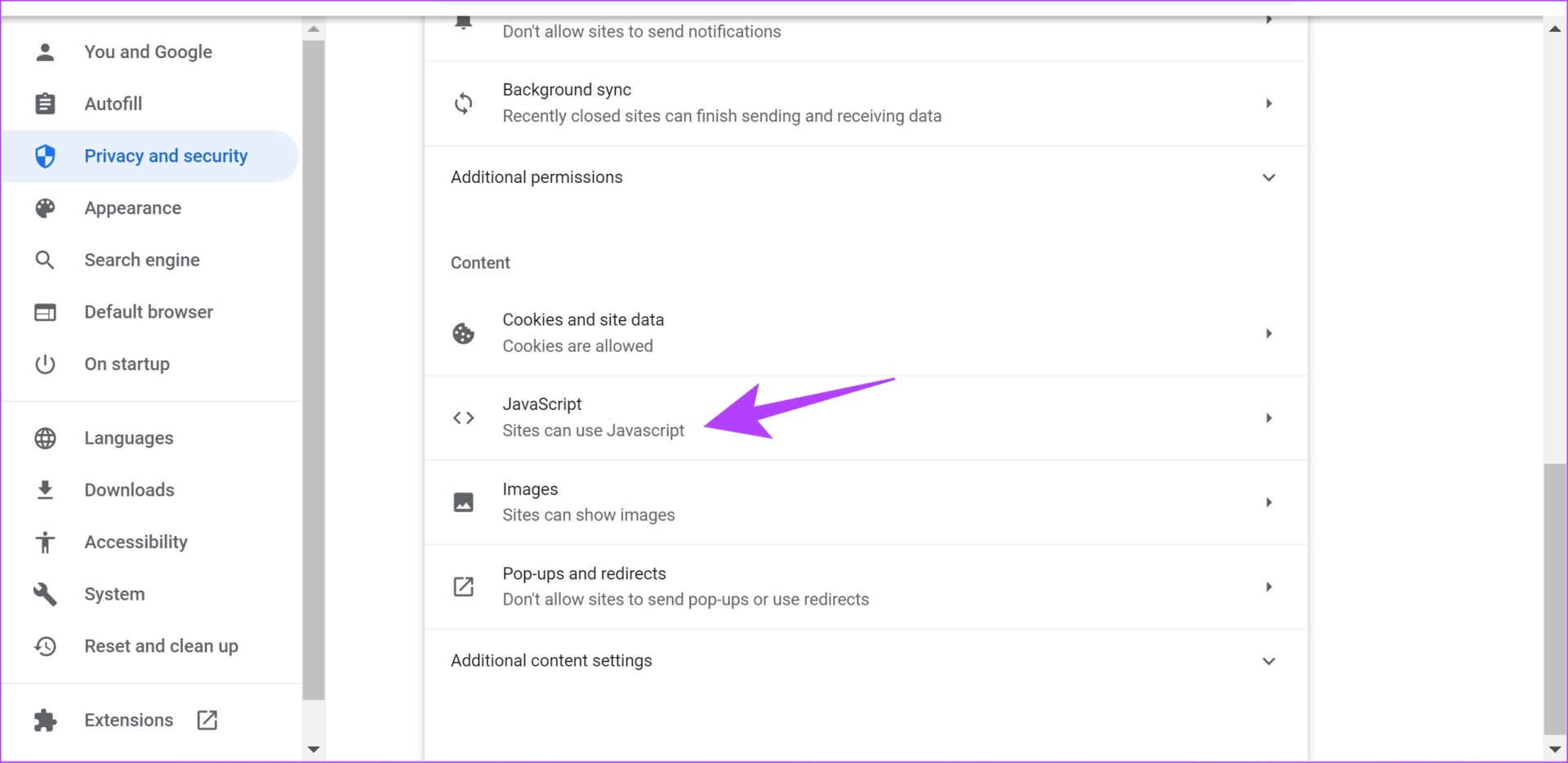 Paso 3: Desplácese hacia abajo y haga clic en JavaScript.