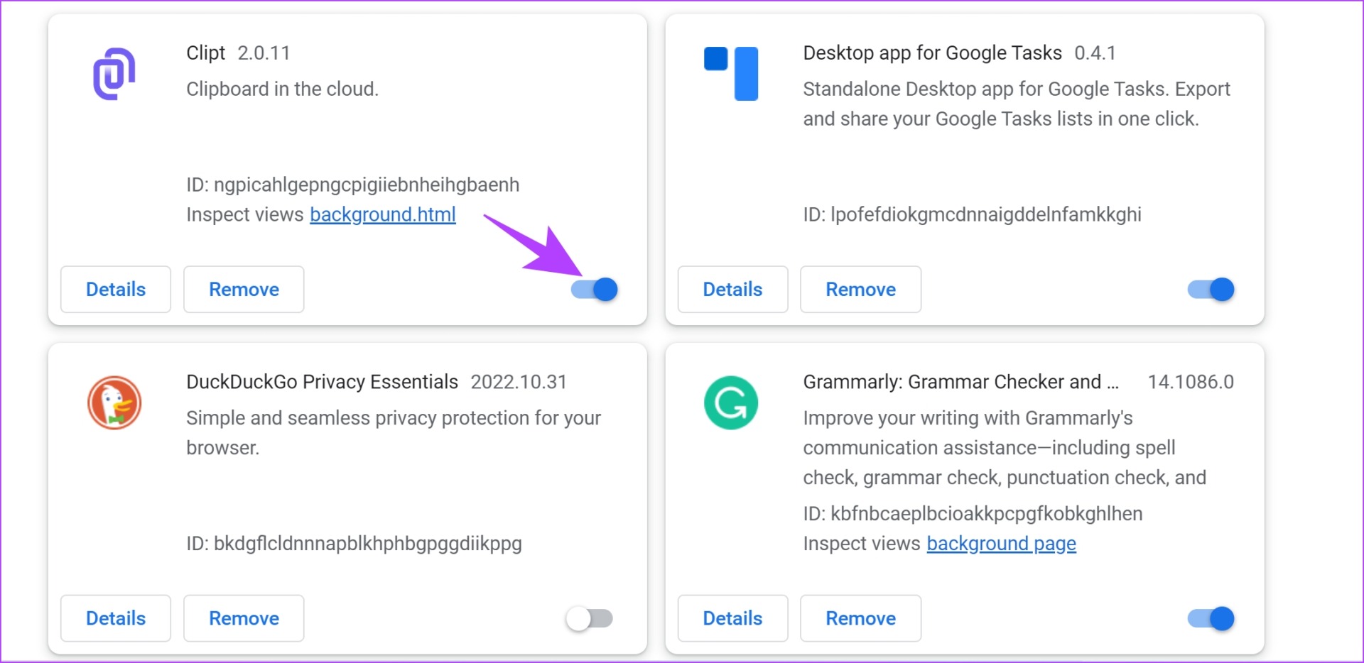 Paso 2: Ahora verá una lista de extensiones instaladas. Apague la palanca para deshabilitar una extensión y verifique si eso soluciona el problema. Repita esto para todas las extensiones instaladas.