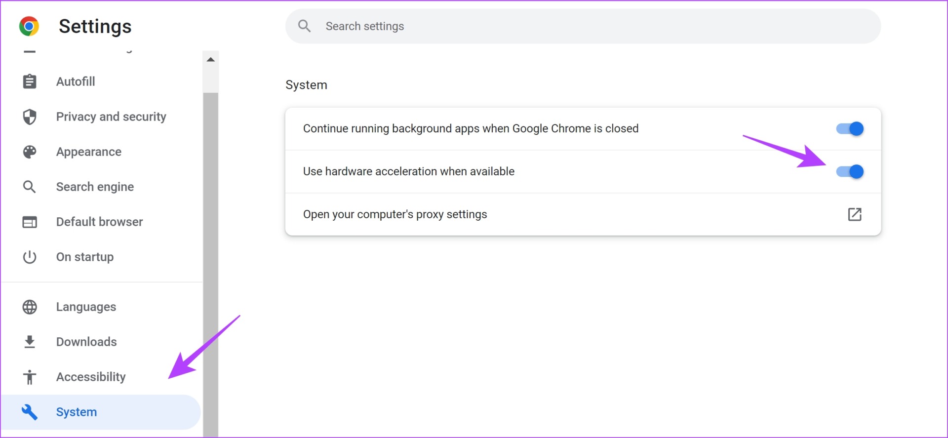 Paso 3: Active la palanca para ‘Usar aceleración de hardware cuando esté disponible’.