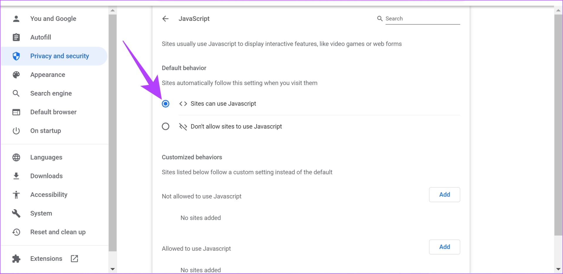 Etapa 4: Asegúrese de seleccionar la opción ‘Los sitios pueden usar JavaScript’ para habilitar JavaScript. Además, asegúrese de no haber agregado ninguna excepción a la lista de comportamiento personalizado.