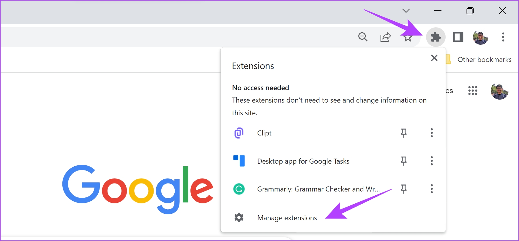 Paso 1: Abra Chrome, haga clic en el icono de la extensión en la barra de herramientas y seleccione Administrar extensiones.