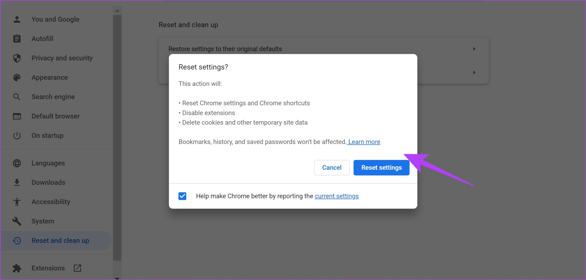 Si ninguno de los métodos anteriores funciona, puede intentar restablecer todas las configuraciones en Chrome.