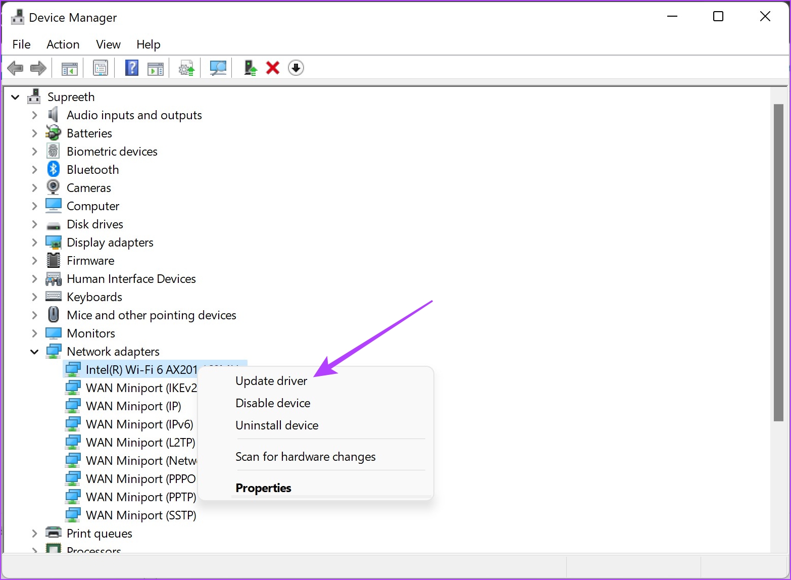Paso 3: Haga clic derecho en su adaptador de red desde el menú desplegable y toque Actualizar controlador. Esto actualizará los controladores de red en su PC.
