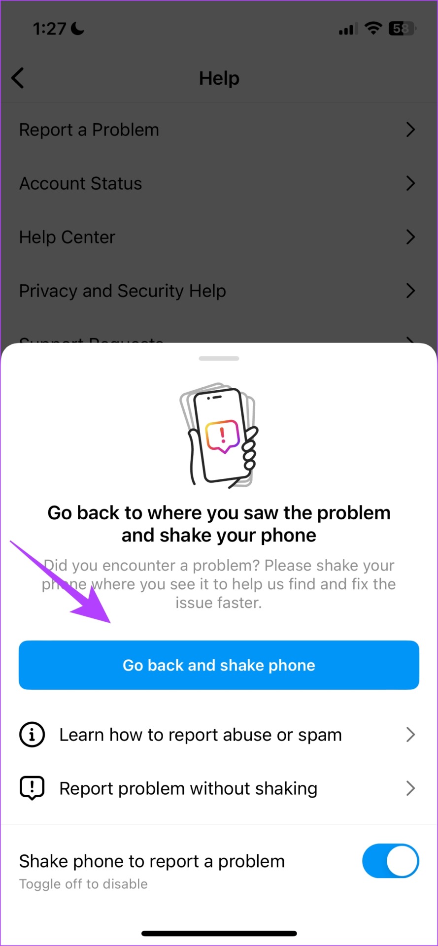 Etapa 4: Ahora puede agitar su teléfono en la página donde está experimentando el problema para informar un problema. Toque en ‘Volver y agitar el teléfono’.
