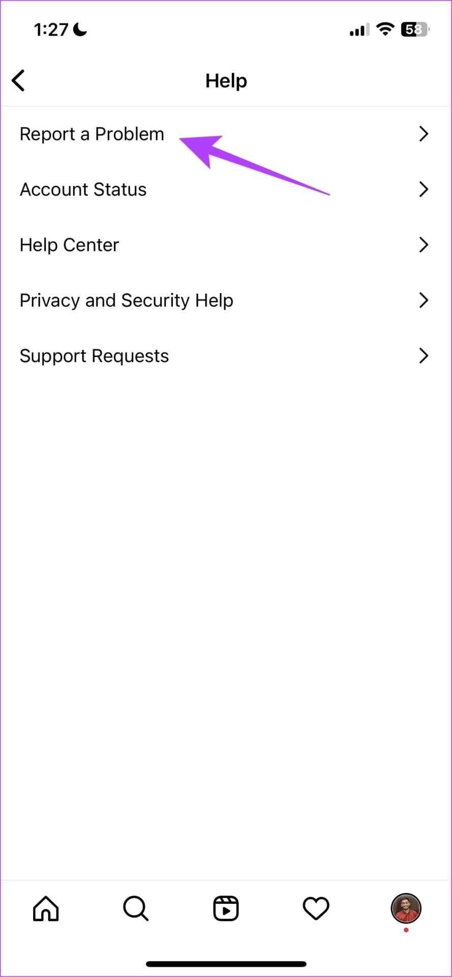 Paso 3: Toque Ayuda y luego toque ‘Informar un problema’.