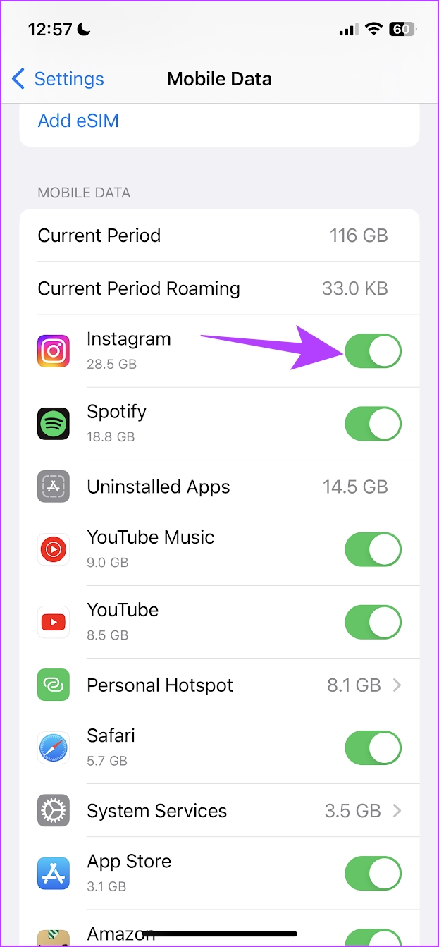 6. Verifique el acceso a datos móviles para Instagram (iPhone).