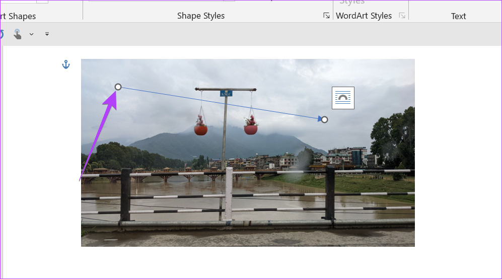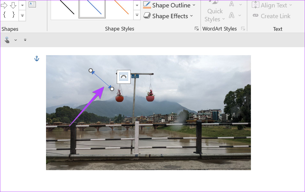 Paso 5: Una vez que seleccione el estilo de flecha deseado, un ícono de puntero reemplazará el puntero del mouse. Ahora, mantenga presionado el botón del mouse y dibuje una flecha en el lugar o la imagen deseada en el documento. Suelte el botón del mouse para terminar la flecha.