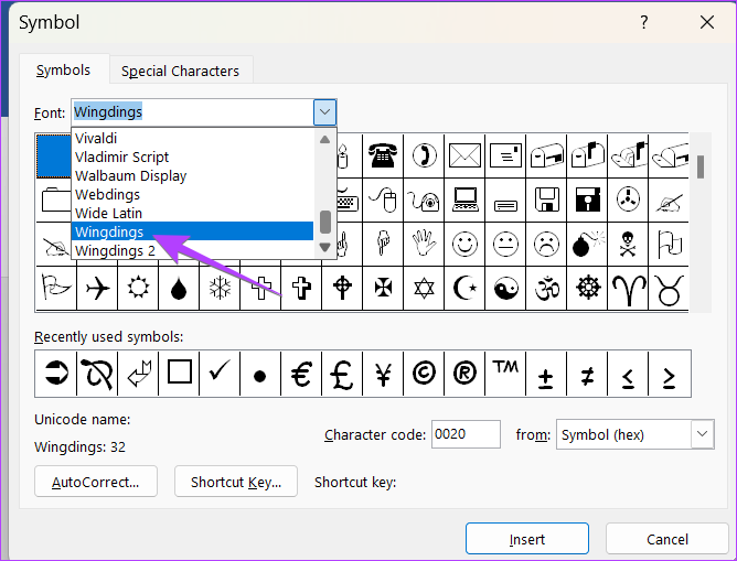 Paso 3: Aparecerá la ventana de símbolos. Seleccione Wingdings en el cuadro desplegable Fuente.