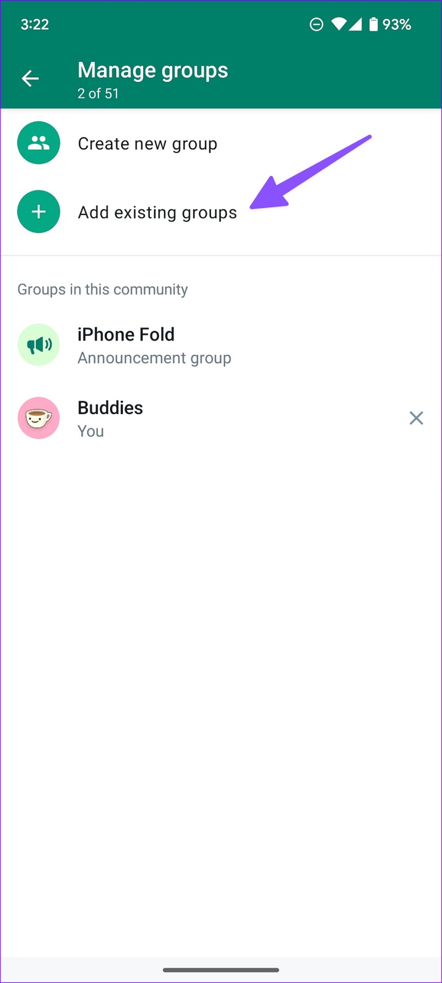 WhatsApp ofrece una opción para agregar grupos existentes cuando creas una comunidad Siga los pasos a continuación para agregarle un nuevo grupo.
