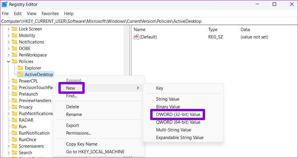 Paso 5: Haga clic con el botón derecho en la clave ActiveDesktop, vaya a Nuevo y seleccione Valor DWORD (32 bits). Nombra la DWORD Sin cambiar el fondo de pantalla.