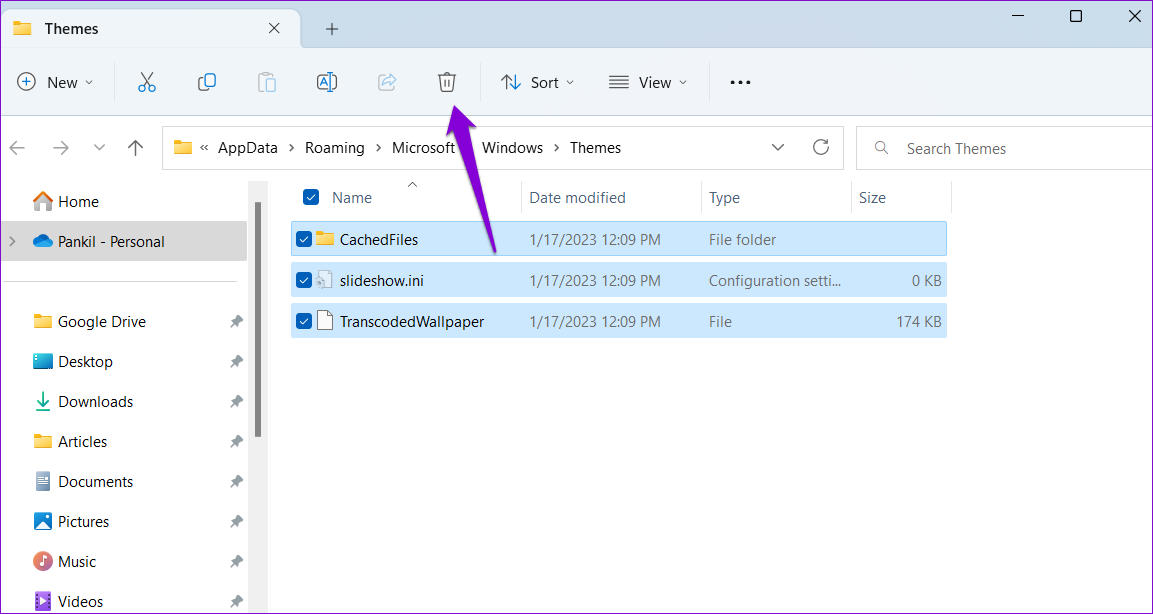 Etapa 4: Presione Ctrl + A para seleccionar todo dentro de la carpeta del tema y haga clic en el ícono de la papelera en la parte superior para eliminarlo.