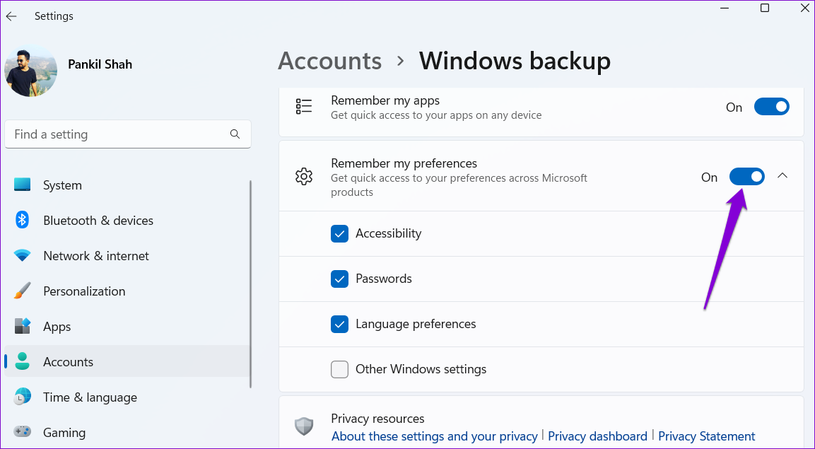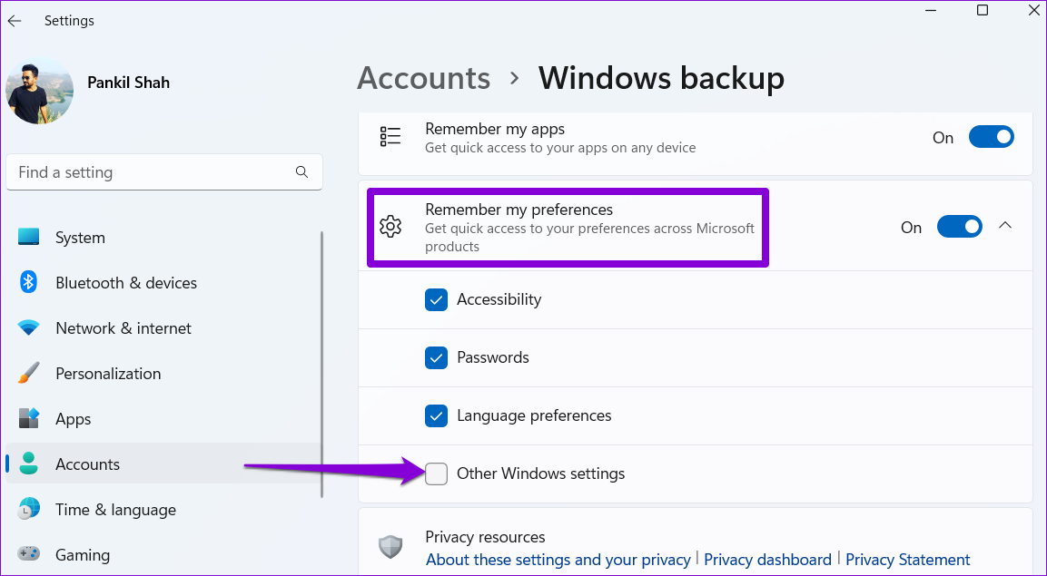 Alternativamente, puede deshabilitar la opción «Recordar mis preferencias» para evitar que Windows sincronice ningún dato.
