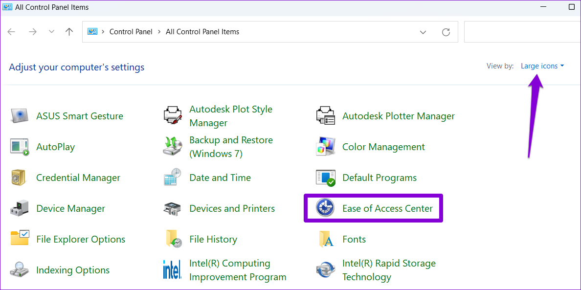 Paso 2: En la ventana del Panel de control, use el menú desplegable en la parte superior derecha para cambiar el Tipo de vista a Iconos grandes. Luego, haga clic en Centro de facilidad de acceso.