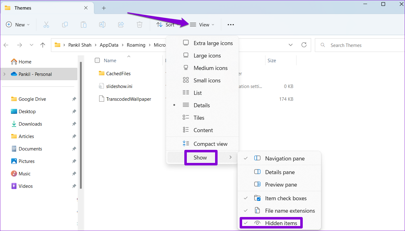 Paso 3: Cuando se abra el Explorador de archivos, haga clic en el menú Ver en la parte superior, seleccione Mostrar y seleccione la opción Elementos ocultos.