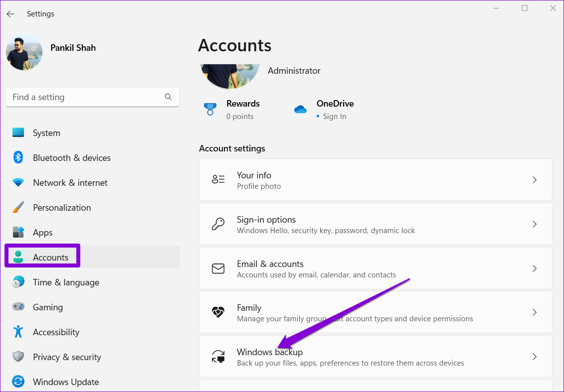 Paso 2: Haga clic en la pestaña Cuentas en la barra lateral izquierda y seleccione Copia de seguridad de Windows en el panel derecho.
