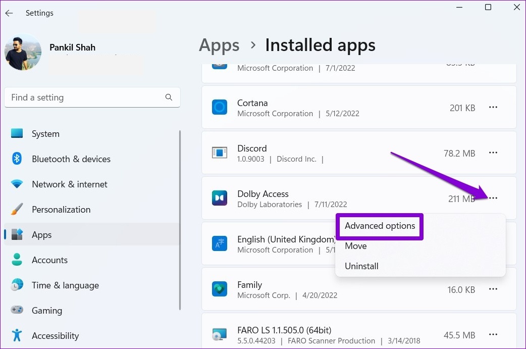 Paso 2: Identifique la aplicación Dolby Access en la lista. Haga clic en el menú de tres puntos al lado y seleccione Opciones avanzadas.