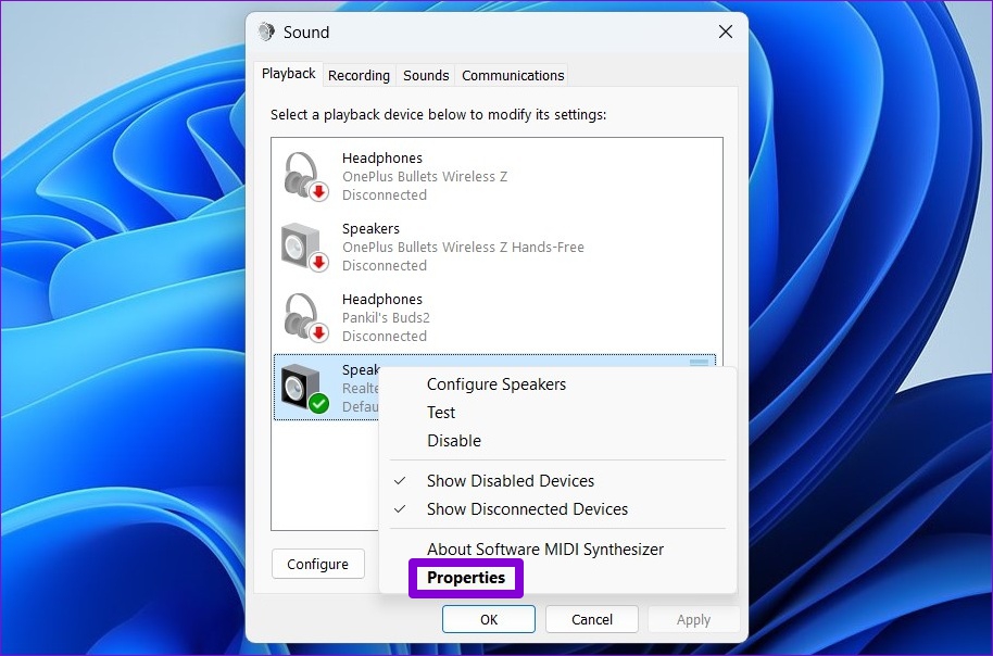 Paso 3: Haga clic derecho en su dispositivo de audio y seleccione Propiedades.