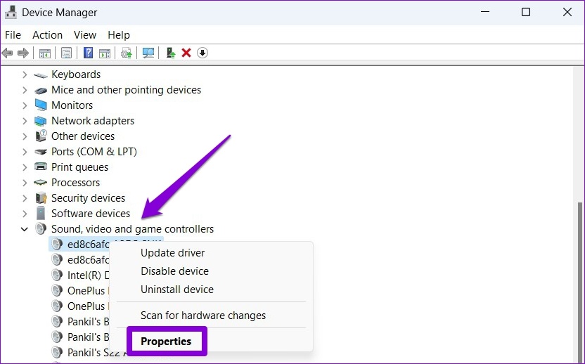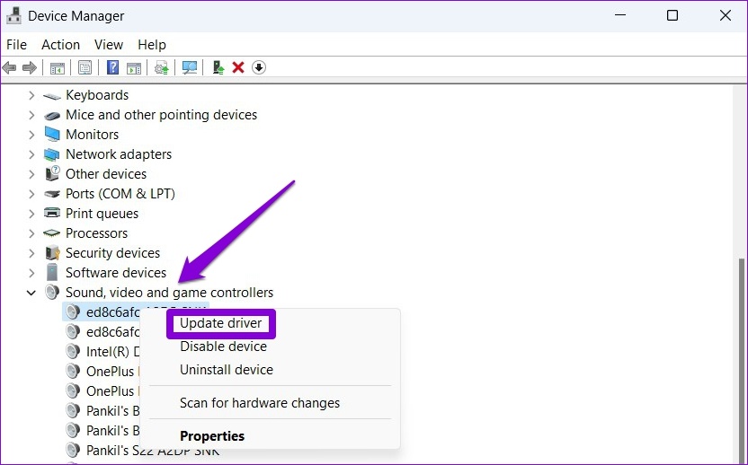 Los controladores de sonido caducados también pueden causar este tipo de problemas. Para solucionar esto, puede actualizar los controladores relevantes desde el Administrador de dispositivos. Así es cómo.