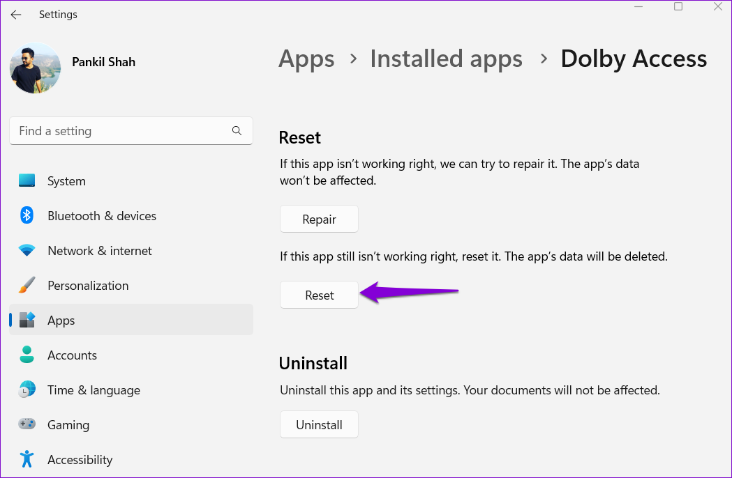6. Repare o reinicie la aplicación Dolby Access