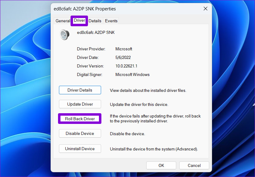 Paso 3: En la ventana Propiedades, cambie a la pestaña Controladores y haga clic en Revertir controlador.