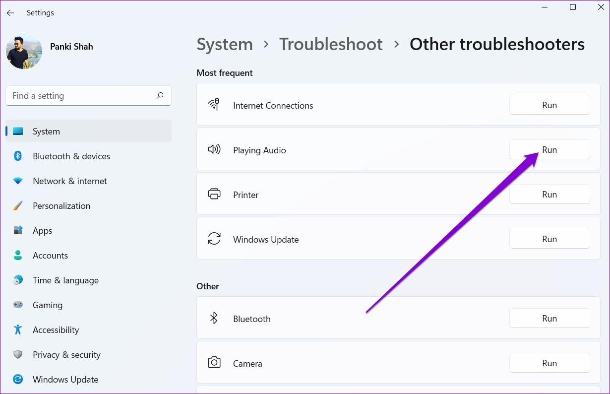 Paso 3: Haga clic en el botón Ejecutar junto al audio en reproducción y siga las instrucciones en pantalla para completar el proceso de solución de problemas.