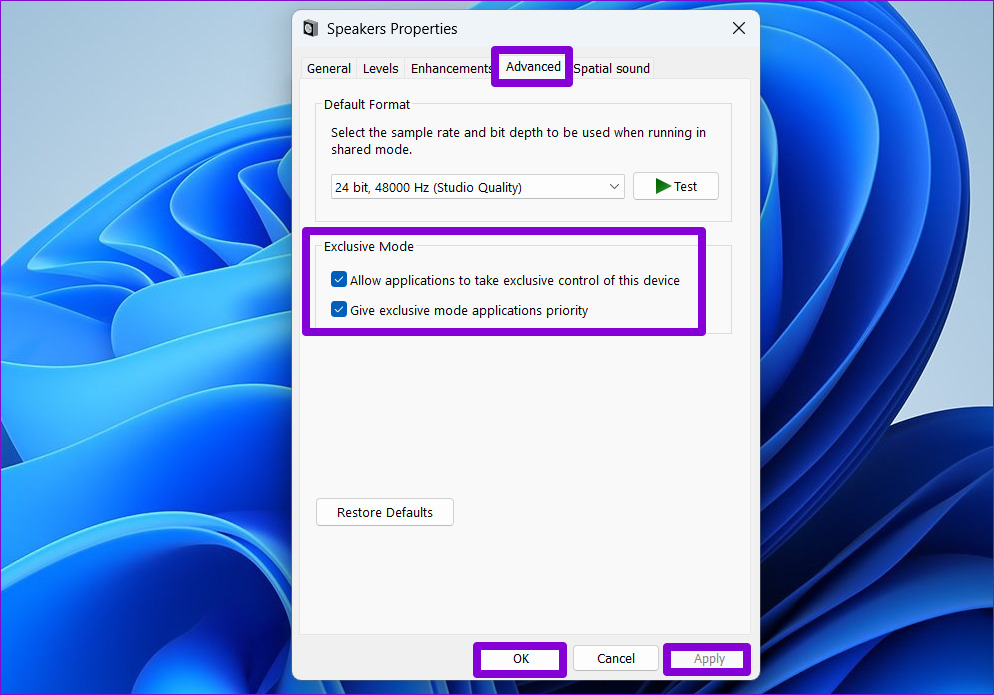 Etapa 4: En la pestaña Avanzado, marque las casillas que dicen «Permitir que las aplicaciones tomen el control exclusivo de este dispositivo» y «Dar prioridad a las aplicaciones de modo exclusivo».