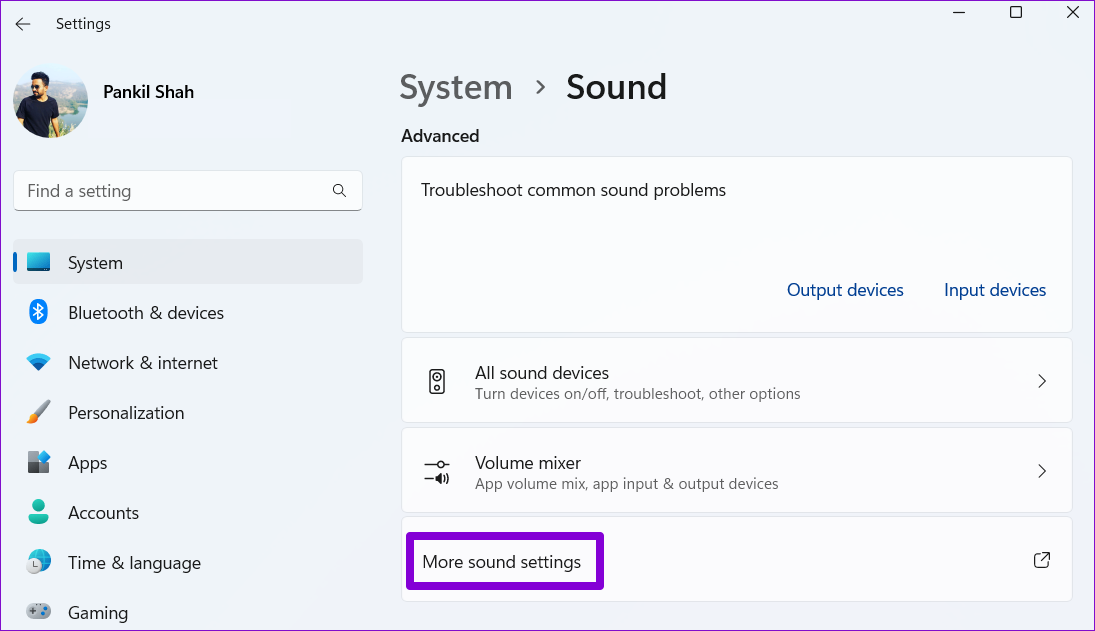 Paso 2: Desplácese hacia abajo hasta la sección Avanzado y haga clic en Más configuraciones de sonido.