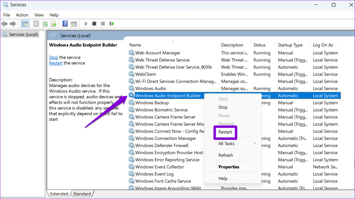 Paso 3: A continuación, haga clic con el botón derecho en el servicio ‘Windows Audio Endpoint Builder’ y seleccione Reiniciar.