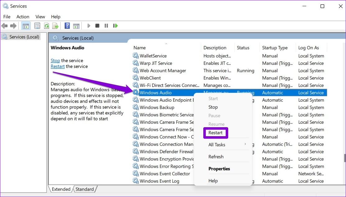 Paso 2: En la ventana Servicios, desplácese hacia abajo para ubicar el servicio de audio de Windows. Haga clic derecho sobre él y seleccione Reiniciar de la lista.