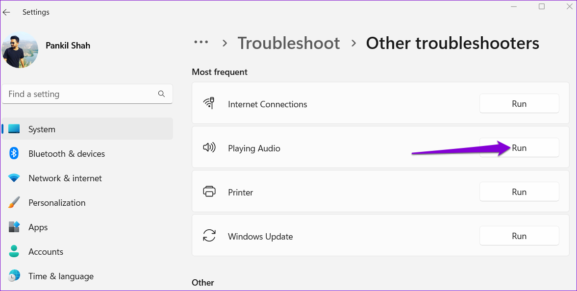 Etapa 4: Haga clic en el botón Ejecutar junto al Solucionador de problemas de reproducción de audio.