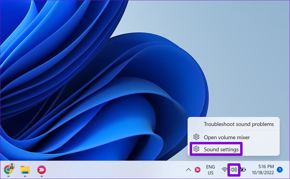 Paso 1: Haga clic con el botón derecho en el icono del altavoz en la barra de tareas y seleccione Configuración de sonido.