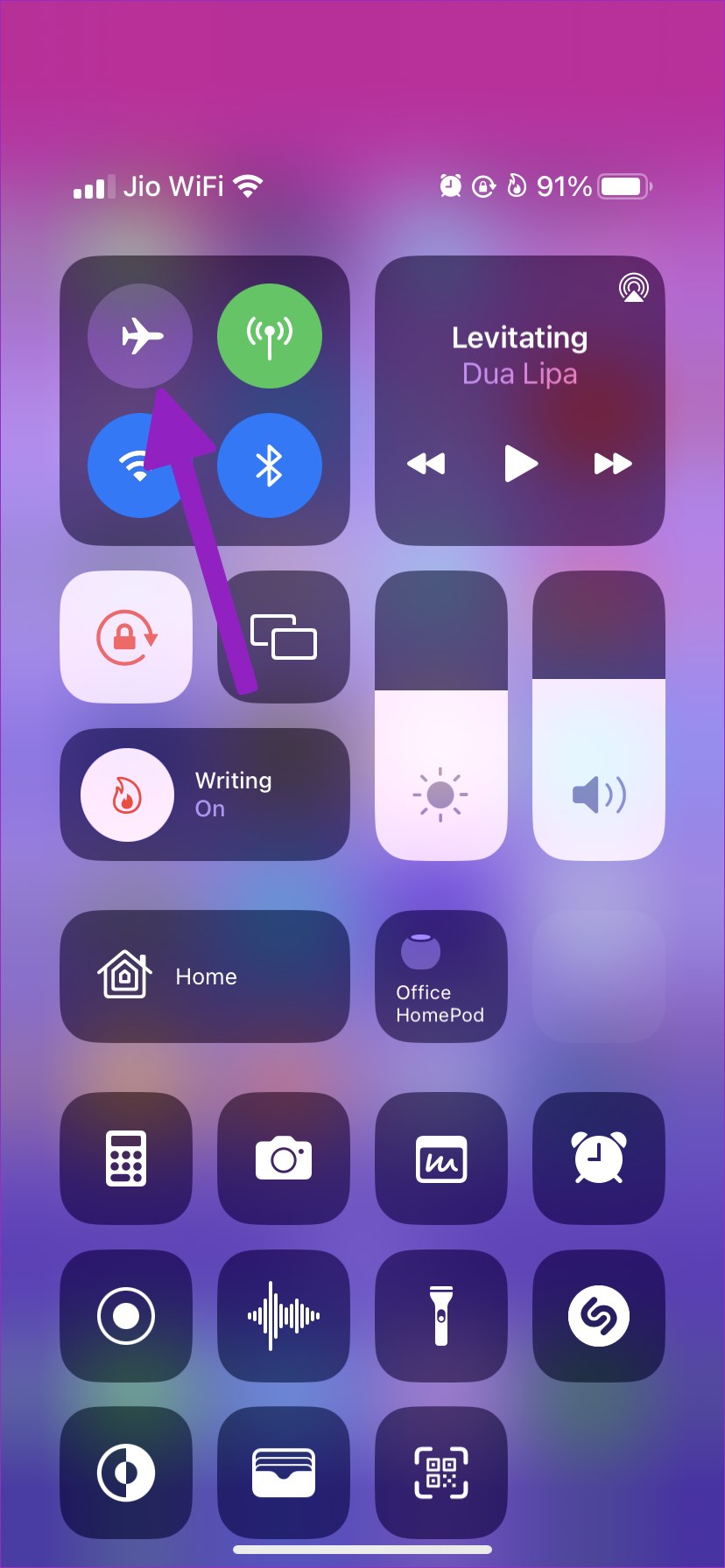 Deslice el dedo hacia abajo desde la esquina superior derecha de la pantalla para abrir el Centro de control: iPhone X y superior. Para iPhones más antiguos, desliza hacia arriba desde la parte inferior de la pantalla. Toca el icono del avión para activar el modo avión. Espere uno o dos minutos y apáguelo.