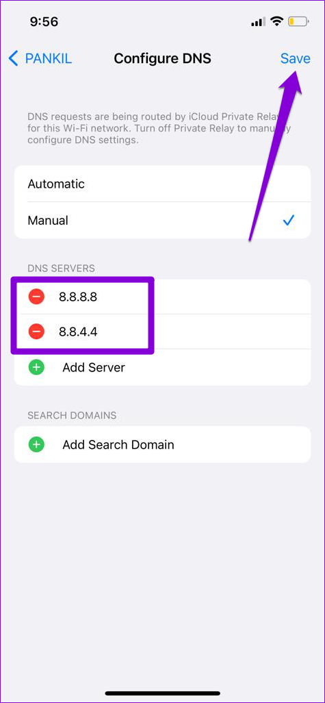 Paso 4: Toque Agregar servidor para acceder a los servidores DNS públicos de Google: 8.8.8.8 Y 8.8.4.4 - en el cuadro de texto. Luego, presione Guardar en la esquina superior derecha.