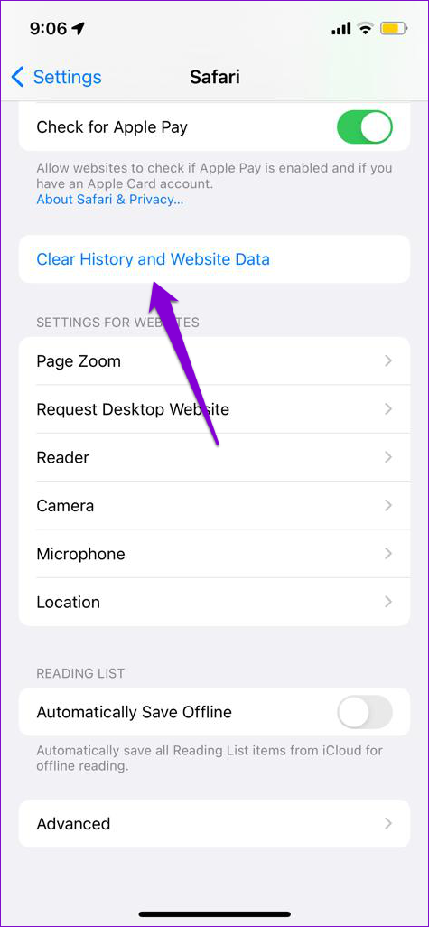 Paso 2: Toque en ‘Borrar historial y datos del sitio web’. Seleccione ‘Borrar historial y datos’ cuando se le solicite.