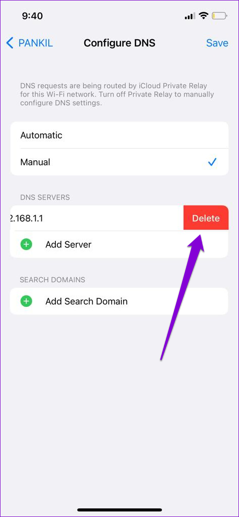 Paso 3: Toque el ícono menos para eliminar las entradas precargadas en Servidor DNS