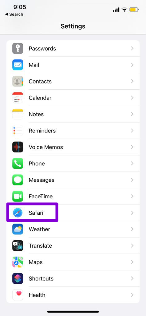 Paso 1: Inicie la aplicación Configuración en su iPhone y navegue hasta Safari.