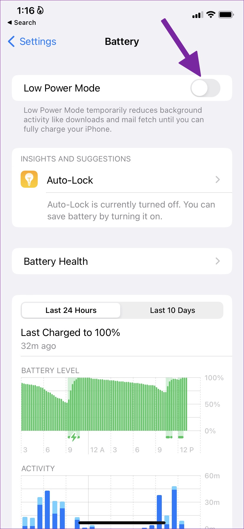 El modo de bajo consumo desactiva las actividades en segundo plano para ahorrar batería y garantizar que su iPhone dure más Sin embargo, también evita cualquier envío invasivo de notificaciones de las aplicaciones. Debido a esto, puede notar un retraso en las notificaciones. Siga los pasos a continuación para deshabilitar el modo de bajo consumo en iPhone
