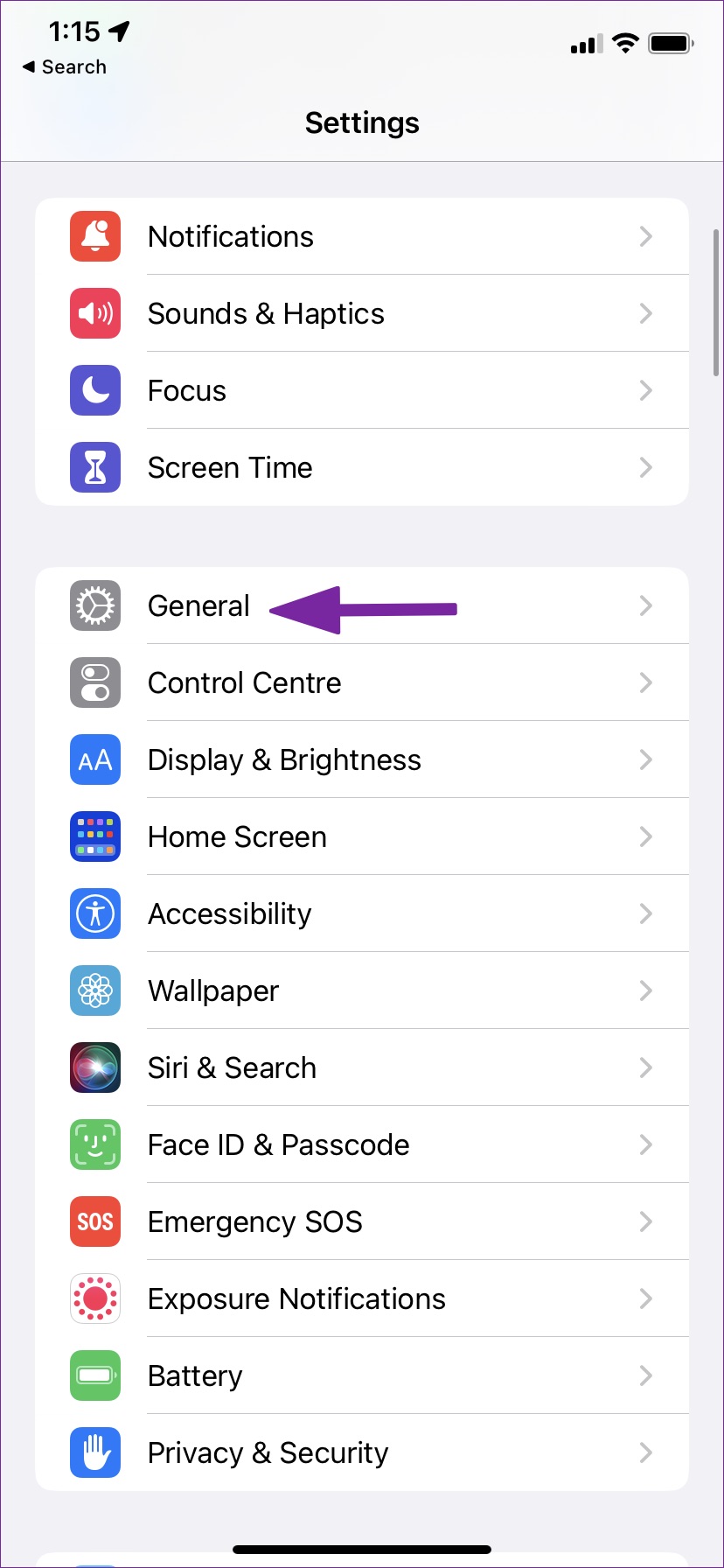 Paso 1: Abra la aplicación Configuración en su iPhone y desplácese hacia abajo para tocar General (lea los pasos anteriores).