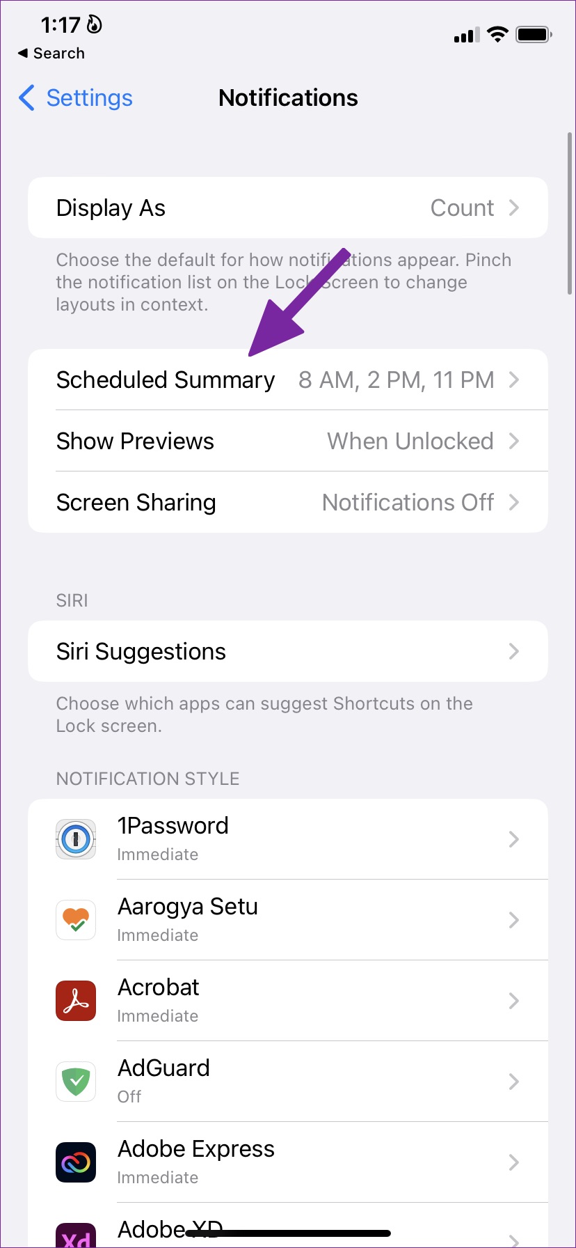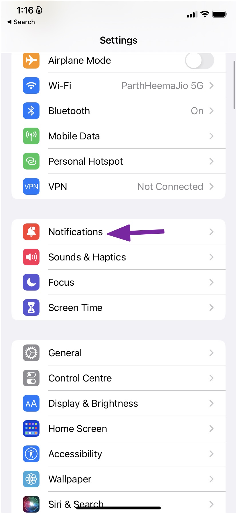 Paso 1: Abra la aplicación Configuración en el iPhone y desplácese hacia abajo para seleccionar Notificaciones.