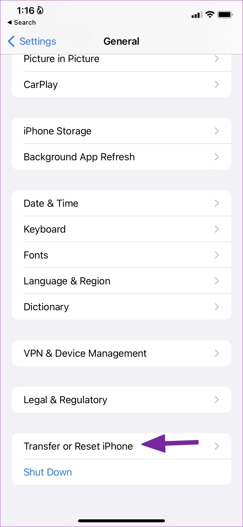 Paso 2: Seleccione ‘Transferir o restablecer iPhone’