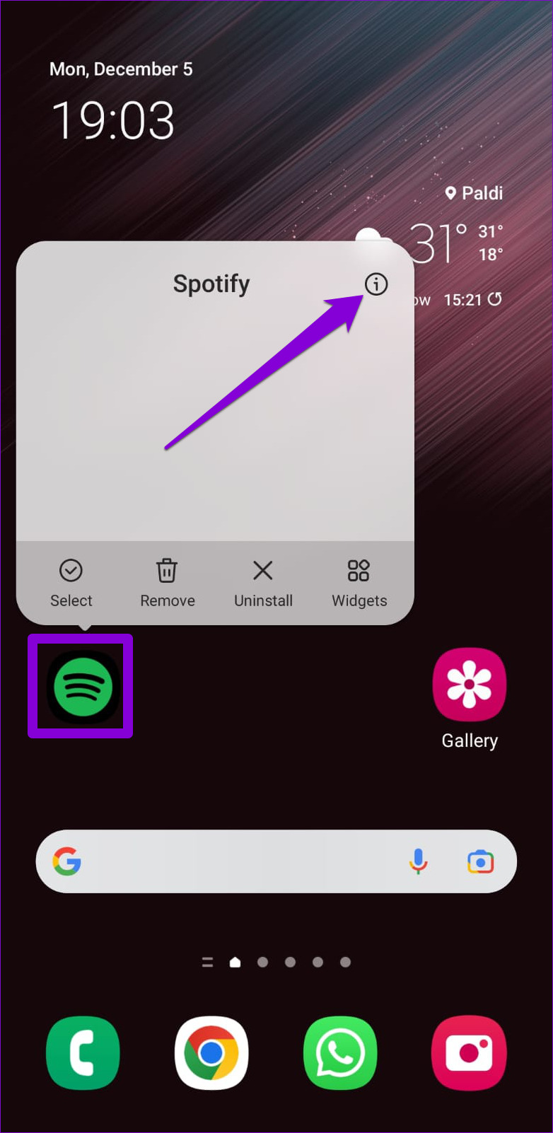 Paso 1: Mantenga presionado el ícono de la aplicación Spotify y toque el ícono ‘i’ en el menú que aparece.