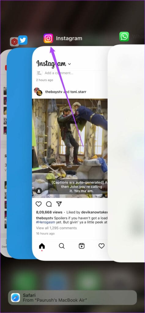 Paso 2: Deslice el dedo hacia la derecha y vea la aplicación de Instagram. Luego desliza hacia arriba y quítalo del fondo.